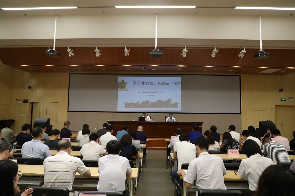 為幫助公司黨員干部更好地理解和開(kāi)展黨史學(xué)習(xí)教育,6月24日,公司黨委邀請(qǐng)了南寧市委市直機(jī)關(guān)工委副書(shū)記藍(lán)迅為公司黨員干部上了一堂生動(dòng)的黨史學(xué)習(xí)教育專(zhuān)題黨課,公司黨委書(shū)記韋文學(xué)主持會(huì)議,公司全體黨員和中層以上領(lǐng)導(dǎo)干部近160余人現(xiàn)場(chǎng)聆聽(tīng)了專(zhuān)題黨課。